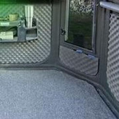 construction, along with acoustical foam wall coverings and carpeted floors with custom foam floor liners, make them